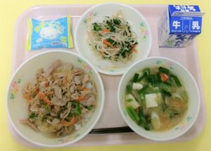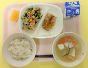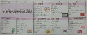 14日から23日にかけて、「心を育む給食週間」として、地産地消給食や昔の日本の給食、各地の特色ある献立、外国の献立が給食に並びました。