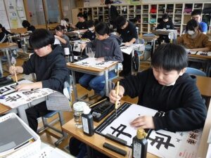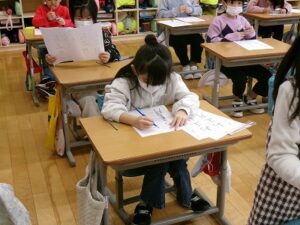 児童達は集中して見本を確認し、丁寧に文字を書き上げていました。完成した作品は、各学年の教室に掲示しています。